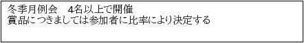 | 12 | 8 | 火 | 冬季月例会(A・Bシニア混合) 参加ポイントなし(4名以上で開催) |